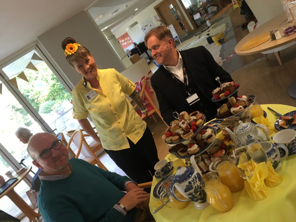 Tia puts to Jackie that this is the hub of the organisation – it’s the public-facing, sustenance-giving, social headquarters, staffed almost entirely by volunteers. It’s located right at the heart of the John Cheverton Centre, opposite the gym, adjacent to the lounge, open to the garden… It’s available 365 days a year. It does a lavish afternoon tea. It’s can be hired for private parties. It does Sunday lunches. It does a full-on Christmas lunch. And everything it serves is garnished with generous portions of – love.