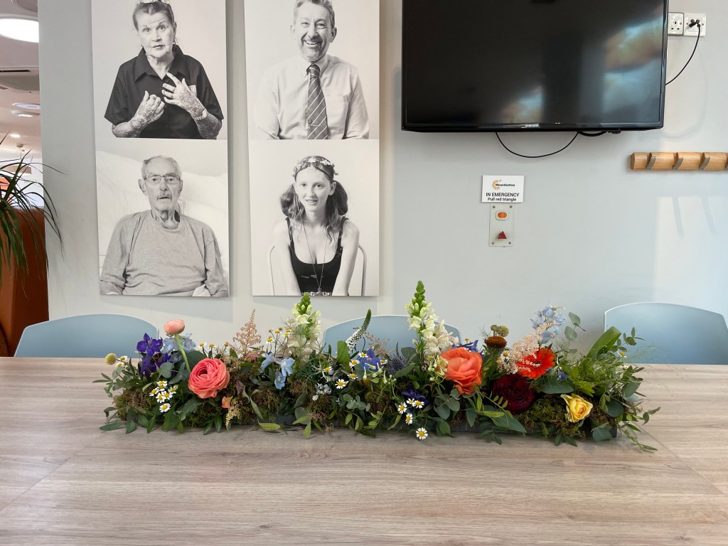 During her last visit to Mountbatten Tia spent a few days in the Mountbatten café. When she arrived, at opening time on Monday, Jackie, the Café Manager, was at a corner table, diary open in front of her. Jackie was working out the complex weekly schedule for the volunteers who are the Café’s backbone. (During these two days Tia met quite a few of these remarkable folks, one of whom kindly took Tia on a tour of the beautiful Mountbatten Gardens –volunteers donate their time across a range of jobs throughout this hospice including gardening and greeting at the reception area). The Café volunteers serve food, make coffees and teas, clear up, and generally distribute bonhomie to everyone and anyone who might happen upon this scene.