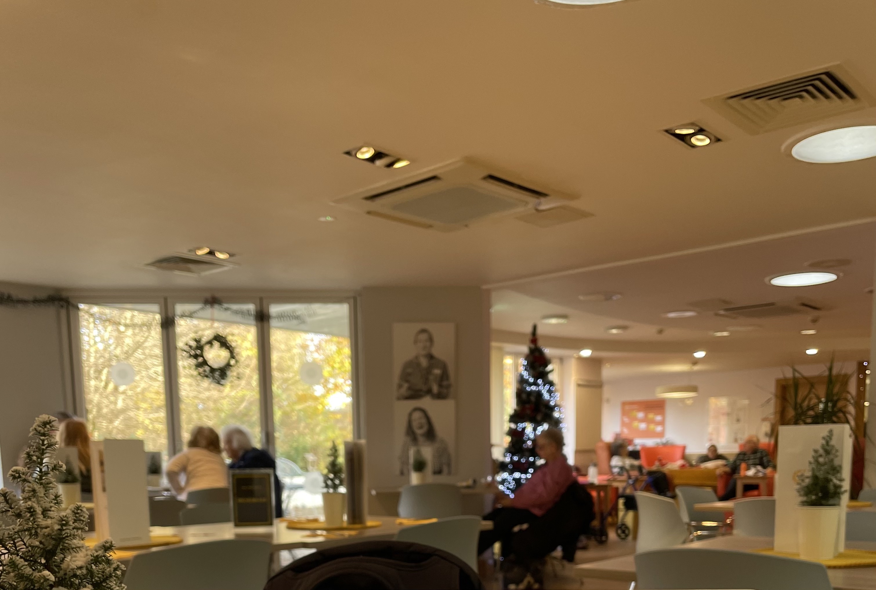 Outside, the tree is lit. Inside, there are at least six (donated) Christmas trees, not counting 16 living mini-trees, one on each table in the café. “There’s no shortage of Christmas trees here,” someone commented as they walked down the corridor.